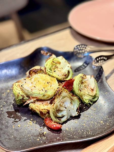 ▼炭烤後的烏魚子高麗菜苗,