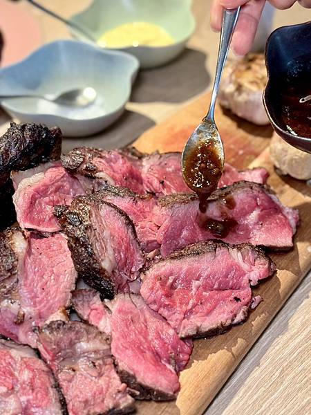 ▼店內提供「有馬山椒醬、海鹽、黃芥末醬」三款醬汁可搭配牛排,
