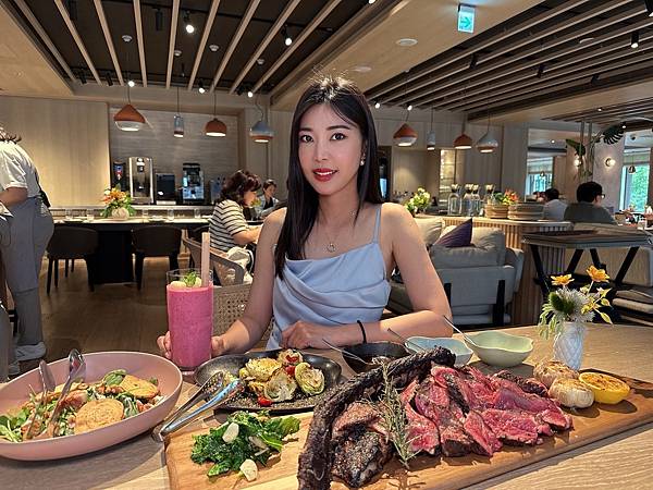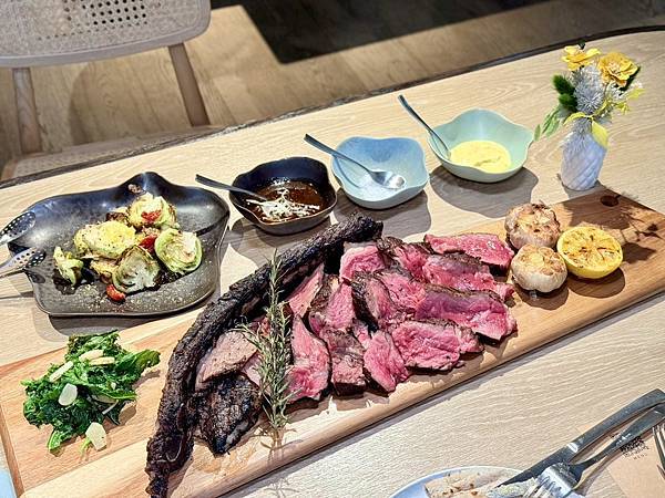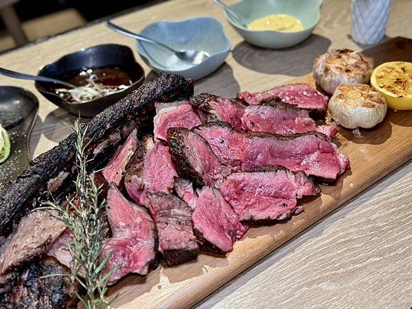 【炭火直烤澳洲精品戰斧牛排(42oz.)、有馬山椒醬汁、烏魚子高麗菜苗】