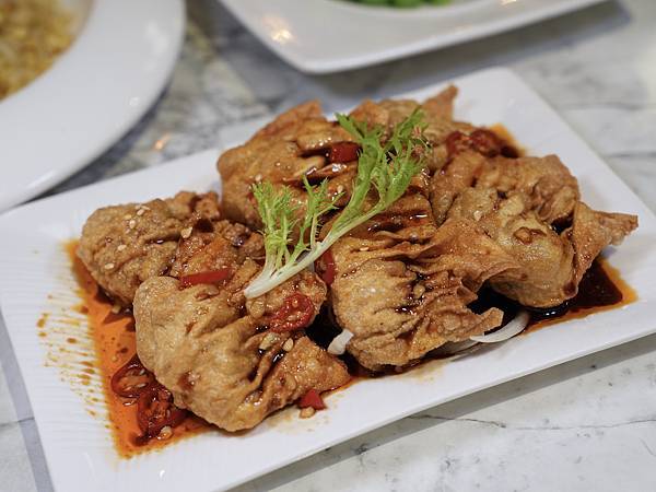 酥炸過的雲吞,搭配特製的椒麻醬汁,