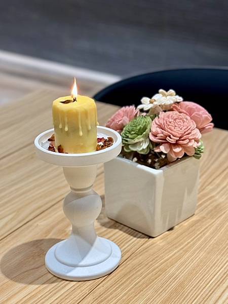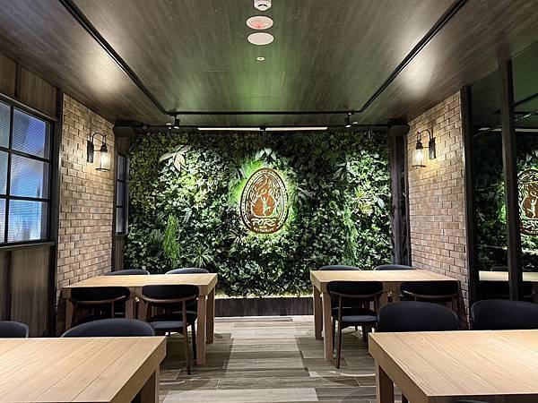 並用溫暖木質調的燈光與餐桌椅加以柔和,