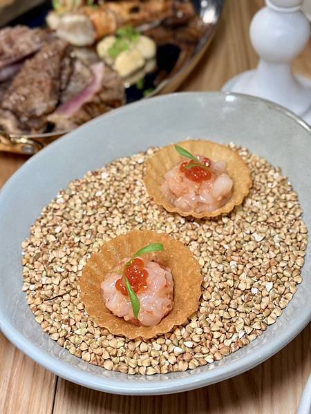 晶瑩剔透的胭鮨蝦鮭魚卵塔塔,