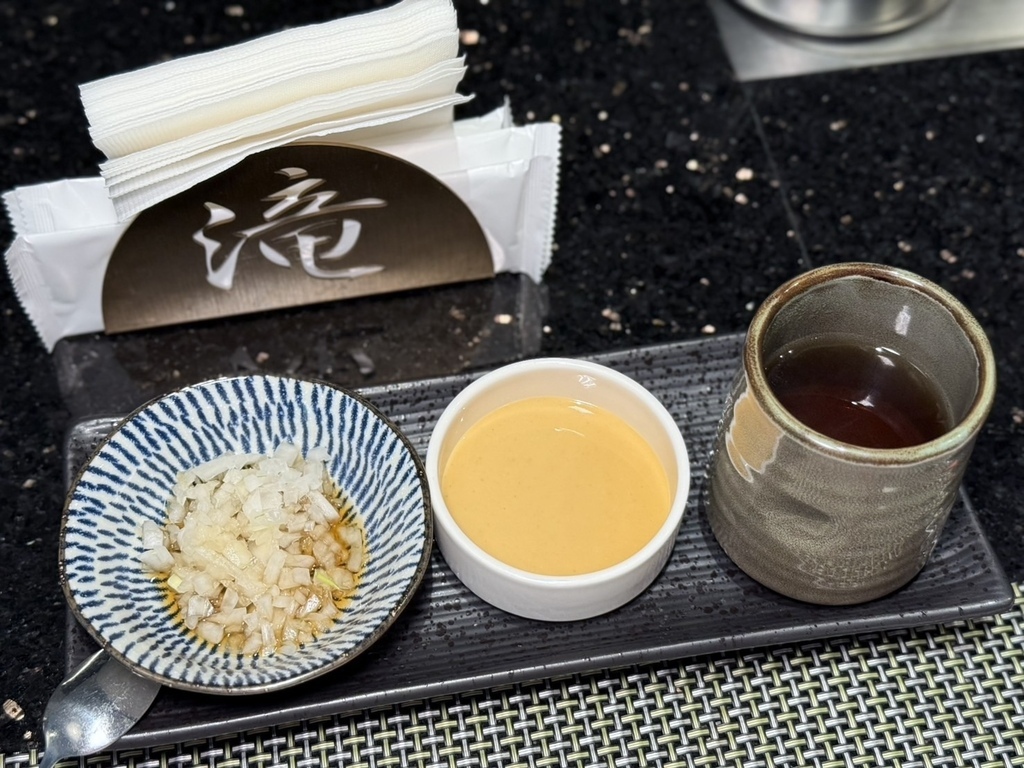 入座後,會送上醃漬洋蔥、蜂蜜芥末醬、熱茶,