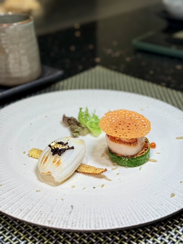 Q彈的花枝,點綴上魚子醬、金箔,