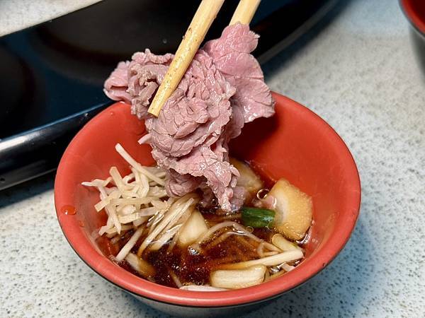 ▼沖入高湯的現切溫體牛肉,