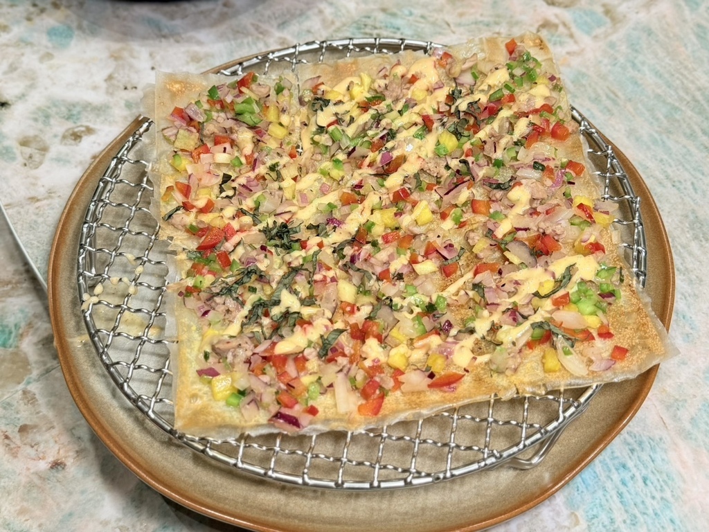 將米紙鋪上鳳梨、肉末與甜椒,小火慢烤而成,