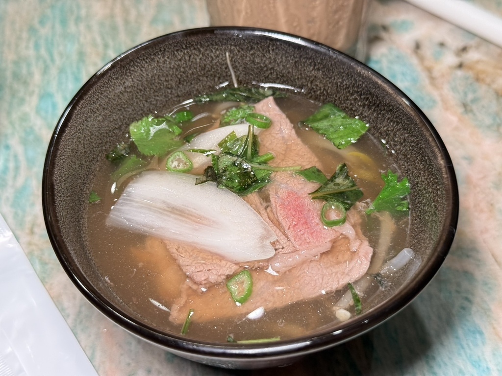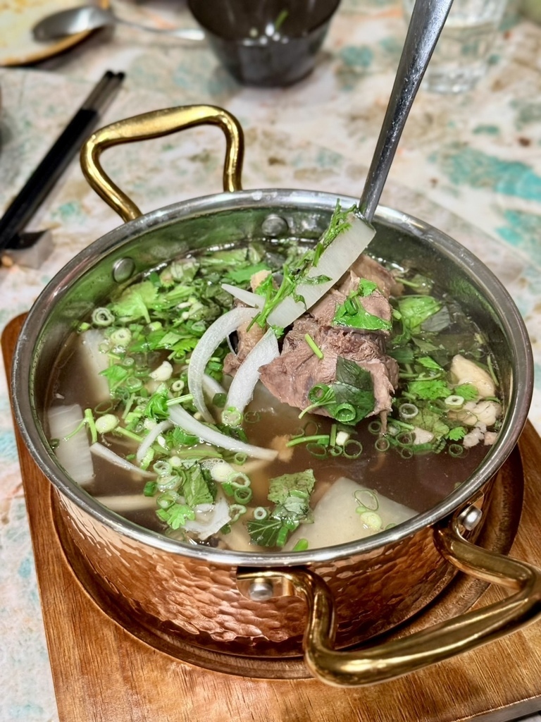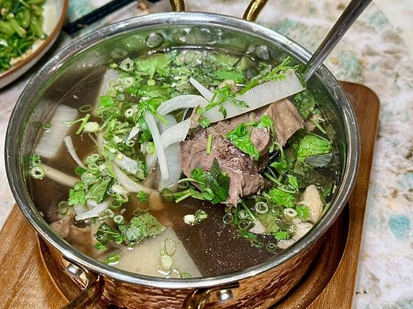 湯底喝起來清爽甘甜,裡頭的牛肉軟嫩好吃,