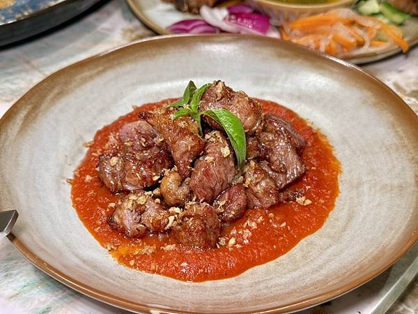 骰子牛肉搭配以番茄、紅椒炙烤成醬汁,