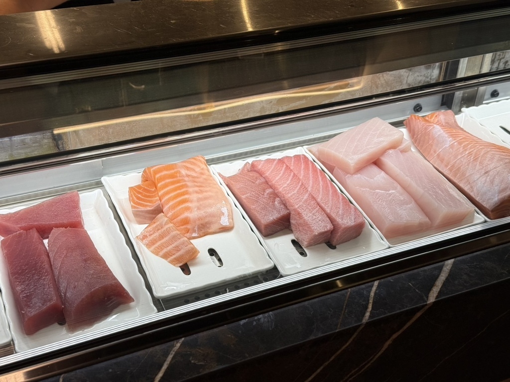 裡頭有鮭魚、鮪魚、紅甘、白旗魚、海鱺、日本真鯛、北海道生食干貝,