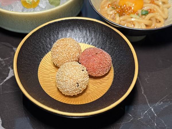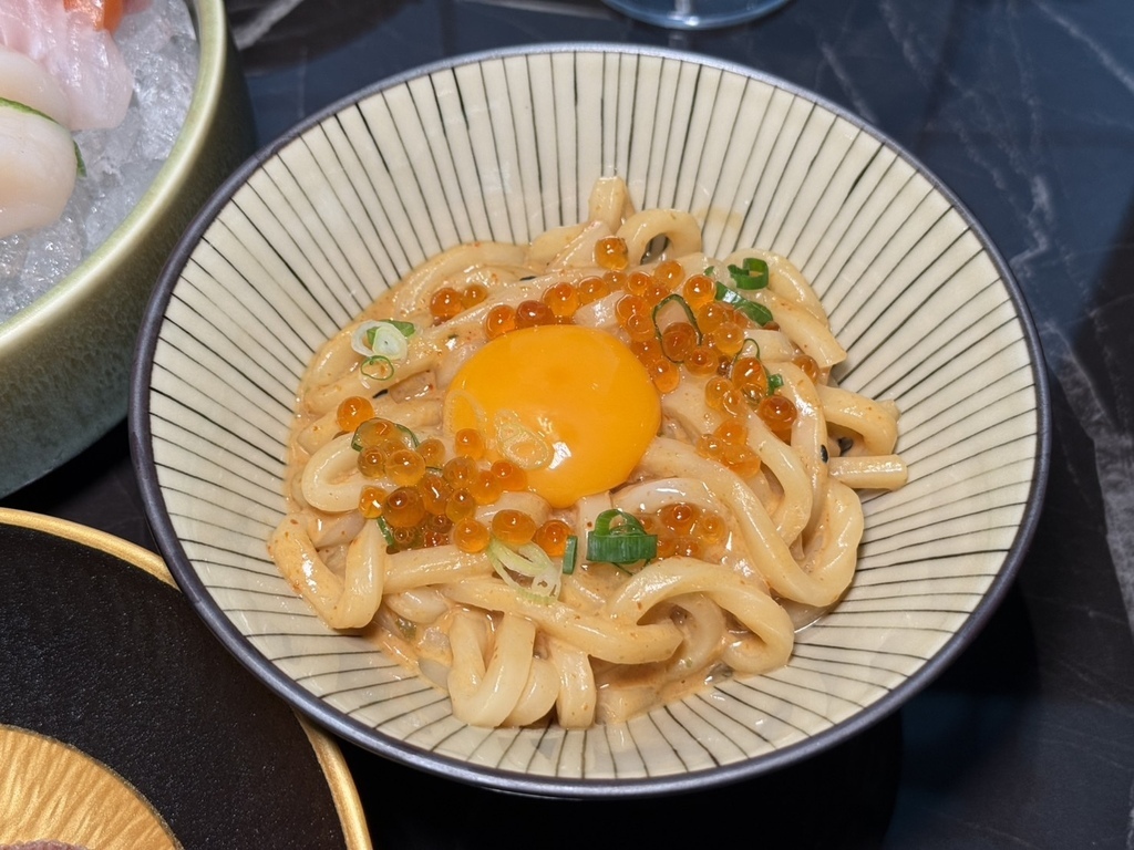 Q彈的烏龍麵條,淋上特製的椒麻醬汁後,拌上鮭魚卵、生蛋黃,
