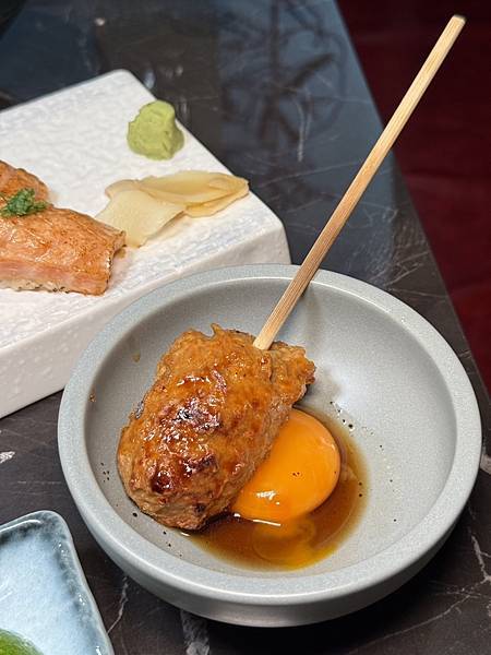 厚實的烤雞肉丸,沾上月見壽喜燒醬汁,