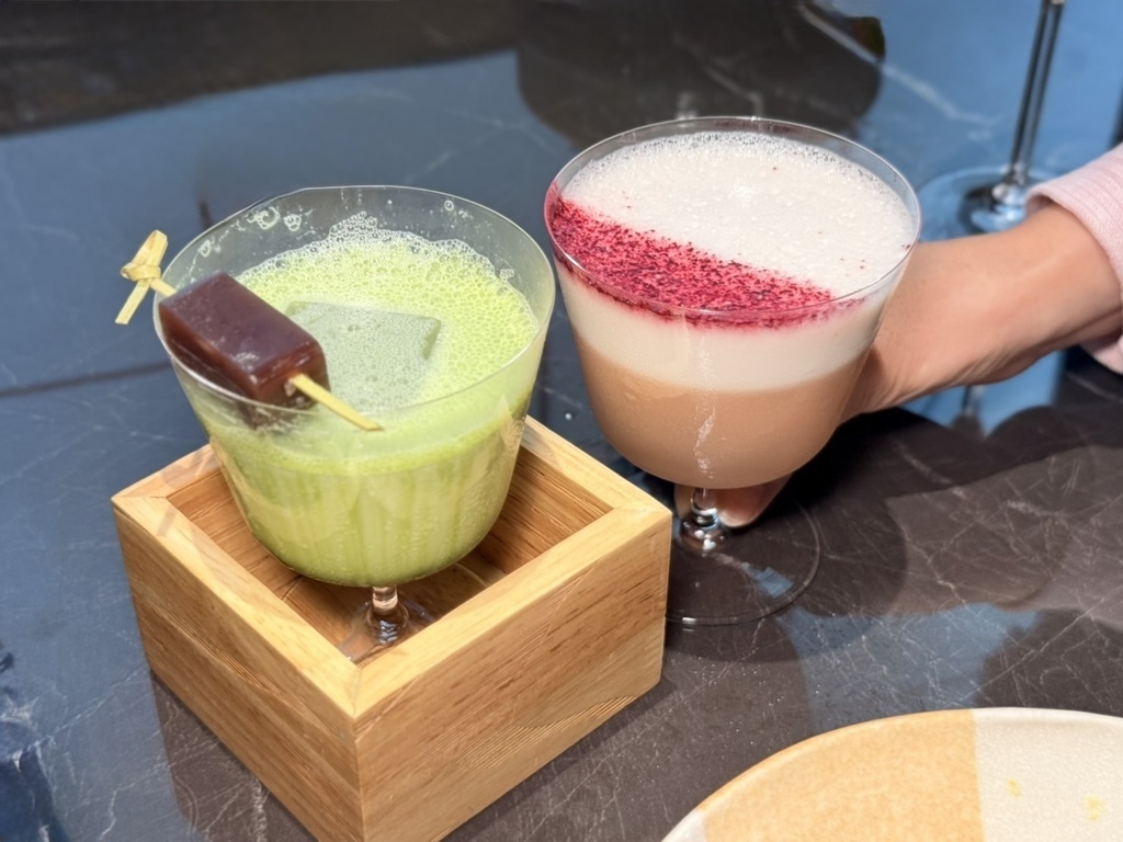 -抹茶雅麗(左),帶有微苦甜的抹茶風味,喝起來像綠奶茶的甜點酒,