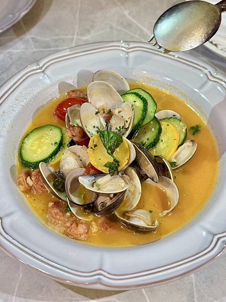 新鮮的蛤蜊,搭配西班牙辣腸、櫛瓜拌炒,