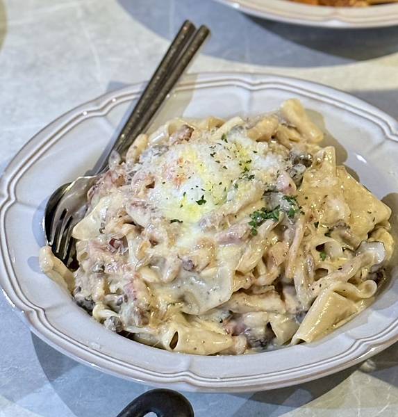 自製的義大利寬帶麵,包裏著滿滿的奶油白醬,