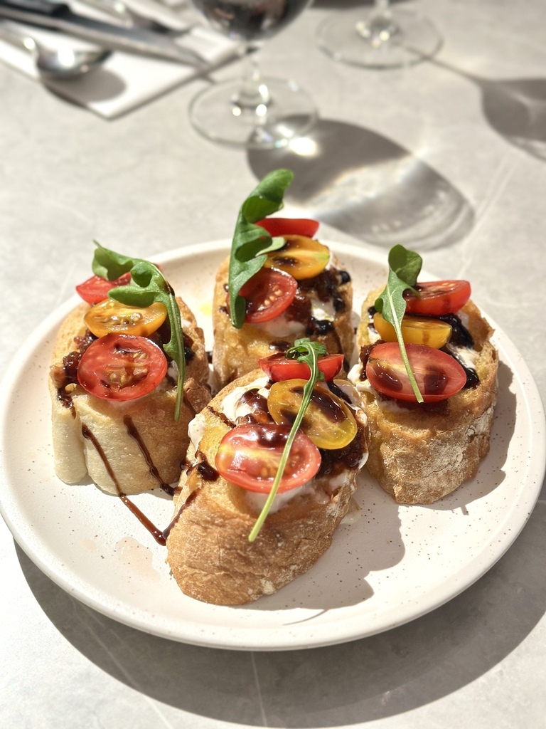 搭配糖漬培根、蕃茄、芝麻葉、巴薩米克醋,