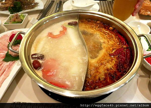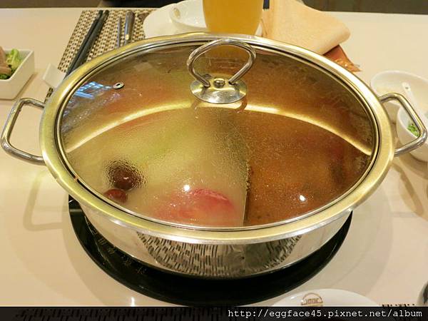 這個鴛鴦鍋可以從「香菜皮蛋、雞湯、鯊魚骨猴頭菇、潮州風味、養生人參、蕃茄牛尾骨、麻辣、秘製鮮魚、港式豬骨」中,任選2種湯頭,我們選擇了招牌主廚清湯+麻辣。蓋上鍋蓋,等湯頭滾~