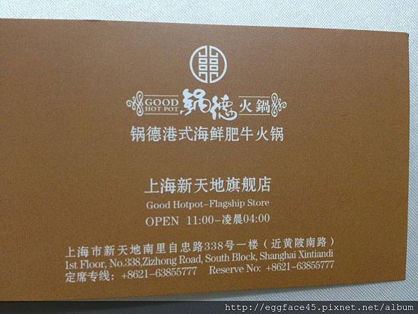 其實注意這間火鍋店很久了,因為每次來上海都一定會來新天地晃晃、吃頓飯,待到9點10點再選一間酒吧去喝一杯。為什麼說注意很久了呢?因為從我第一次看到這間店的招牌廣告的時候,明明就很想吃,但理智告訴我既然到了上海,就應該吃「本幫菜」才對,所以去吃了「采蝶軒」;第二次來上海又看到這間店的招牌時,一直在2樓3樓4樓鬼打牆,就是找不到這間店,以致於看得到吃不到,找得肚子又餓,所以去吃了一間日式燒烤單點吃到飽;第三次,也就是這一次,晚餐時間到了現場剛好有位置,就很開心的入座了