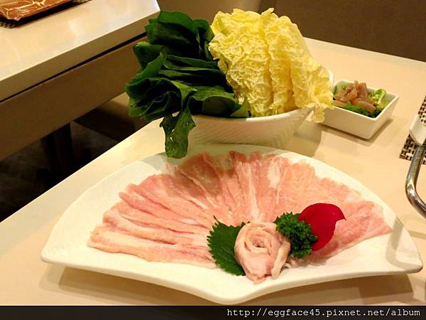 時蔬拼盤+黑豚肉。我要講的是這個黑豚肉,看起來很粉白,類似松板豬的感覺,煮起來非常的「彈牙」,有一點脆脆QQ的感覺。