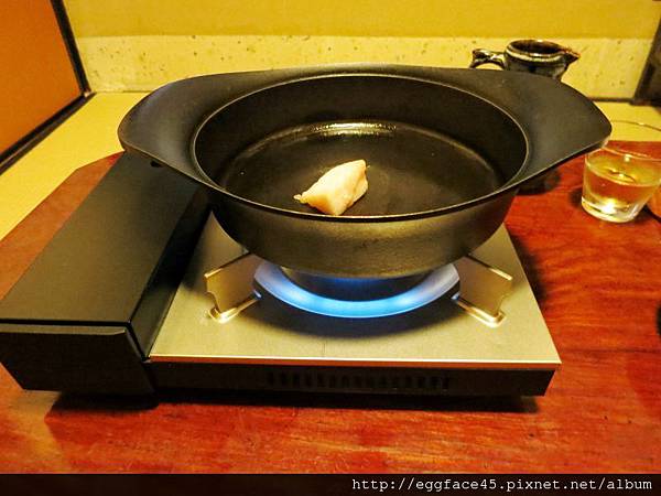 吃完前菜,鍋子端出來了,這是吃壽喜燒的鍋子,看起來雖然沒有像吃涮涮鍋的那麼強,但用對鍋子才是重點嘛!!!你看看,放一塊豬皮來熱鍋,保持其不沾鍋的特性。