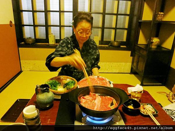 很高興這樣誤打誤撞的吃到如此美味又有故事的十二段家,回台灣後搜尋引擎一轉才知道原來十二段家在京都是非常遠赴盛名有口碑的一間店;也許是不知道它的任何故事,才能在用餐中得到最初衷的體會,才能更用心的吃出它的不一樣。我想,要找美味的餐廳並不難,但是要找尋到有故事的餐廳那就不見得容易了,我們坐在小小的和式包廂裡,看著老闆娘用心服務的身影,用英文夾帶日文敘說著她和這間店的故事,看著她臉上歲月的痕跡,吃下肚的除了軟嫩鮮甜的肉,還有百分之百的誠意,很像是過年回到鄉下,許久不見的阿嬤準備著一桌好料要煮給孫子吃的感覺。我之所以喜歡這間店最近的原因就是你可以直接看到侍者在你面前做料理的那份用心,這是躲在廚房中的名廚表現不出來的。在這裡用餐,聽她介紹十二段家的歷史特別有感觸,因為她的公公就是shabu shabu和sukiyaki的創始人,聽她說到此處,臉上還顯露出驕傲與得意;65年前她還是住在東京的小姑娘,嫁到京都後就是她與十二段家淵源的開始,我想她的故事,就是十二段家好吃的酌料。