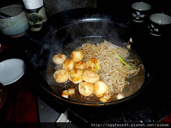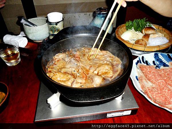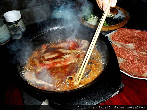 最後一片肉,搭配著香菇一起煮,壽喜燒好吃的關鍵在於(1)肉質本身。(2)醬汁。(3)雞蛋。