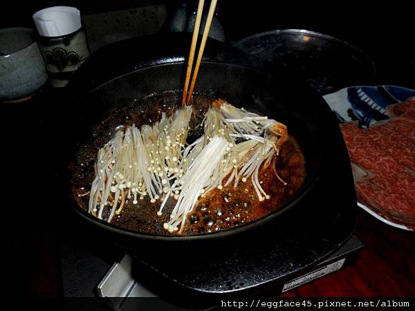 金針菇下鍋囉~!!此時老闆娘告訴我們,他先生的爸爸,也就是他公公Nishigaki桑,是壽喜燒的最早的創始者,就在這間屋子裡,也就是這間店裡。她還說英國的查理王子也曾經到過這裡用餐哦!!