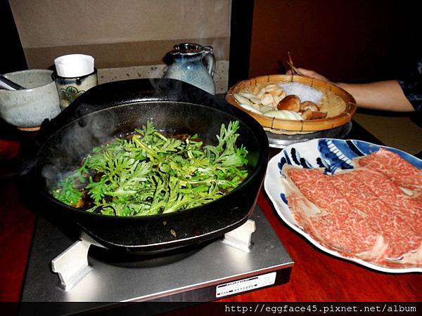 有別於東京的壽喜燒習慣先把肉全部吃完,再下蔬菜,讓菜吸收到肉汁的湯味。